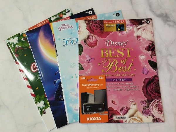 1) STAGEA Vol.52 Christmas Hits Grade 7-6 2) STAGEA Disney Series Vol.7 Aladdin Grade 6-5 3) STAGEA Vol.3 Disney Princess Level: Beginner 4) STAGEA Vol.11 Disney Best of Best -Ballad Edition ~ Grade7-5